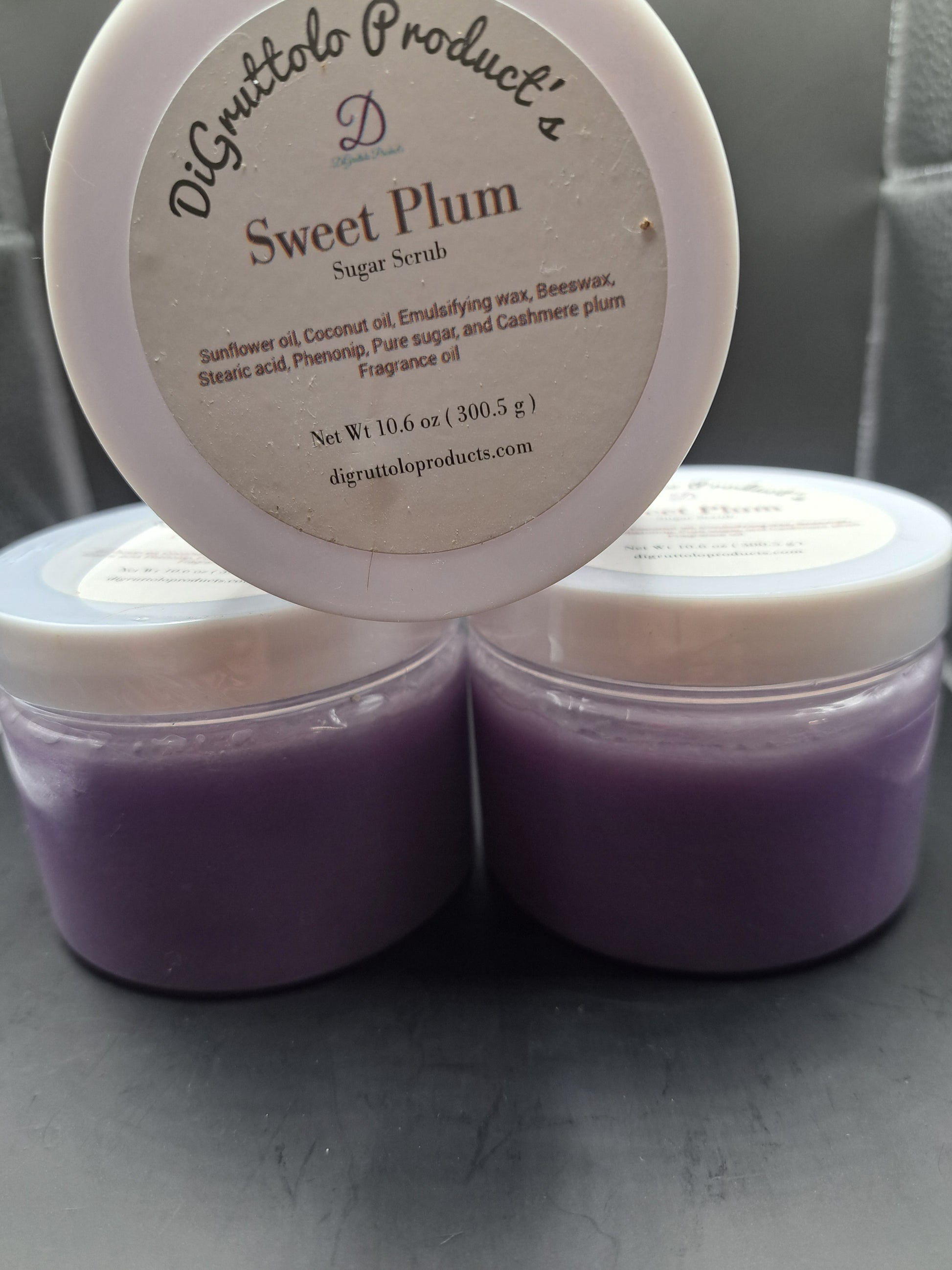 The Sweet Plum Sugar Scrub is a luxurious and indulgent product that will leave your skin feeling soft, smooth, and rejuvenated. Made with high-quality ingredients, this scrub is perfect for exfoliating and moisturizing your skin. The main ingredients include sunflower oil, coconut oil, emulsifying wax, beeswax, stearic acid, phenonip, pure sugar, and cashmere plum fragrance oil. These natural and nourishing components work together to gently remove dead skin cells and reveal a radiant and healthy complexion. With a weight of 10.6 oz, this scrub is the perfect size for daily use and will last you a long time. Treat yourself to the Sweet Plum Sugar Scrub and experience the ultimate pampering session for your skin.